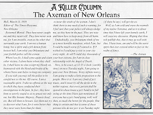 They have never caught me and they never will. They have never seen me, for I am invisible, even as the ether that surrounds your earth. I am not a human being, but a spirit and a demon from the hottest hell. I am what you Orleanians and your foolish police call the Axeman.